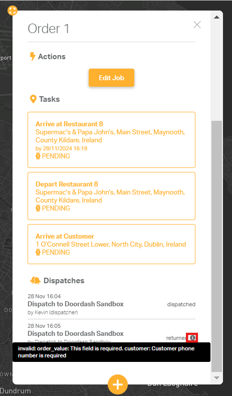 - Scroll down to the Dispatches section and hover your mouse over the information icon beside the word Returned and the return reason sent by the fleet will be displayed.